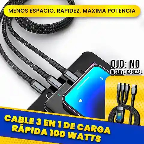 El CABLE 3 EN 1 DE CARGA RÁPIDA 100 WATTS está diseñado para simplificarle la vida y, al mismo tiempo, añadir un toque de estilo a sus accesorios tecnológicos. Con su característica luminosa única y sus sólidas capacidades, es imprescindible para cualquiera que busque una solución de carga versátil y eficiente.